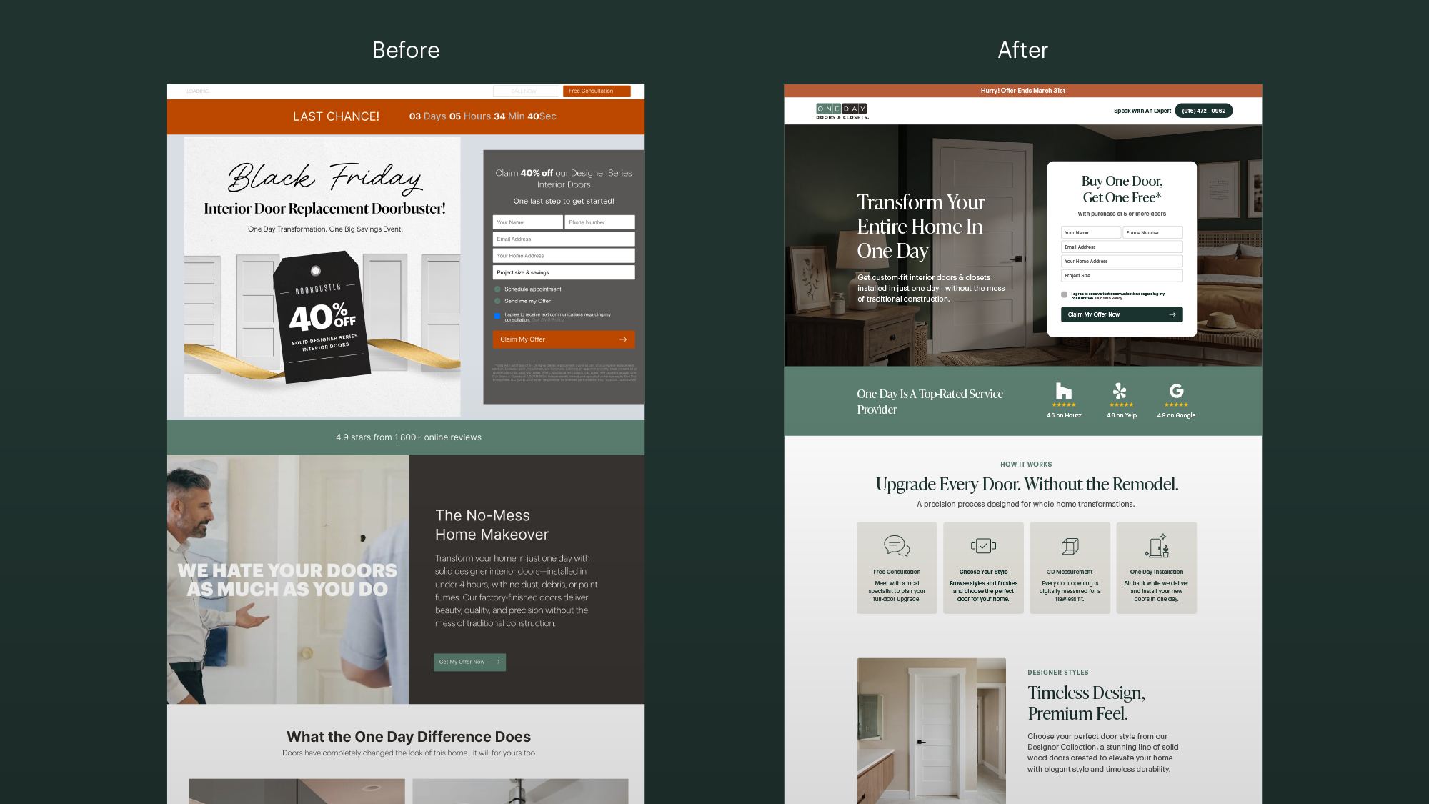 One Day Doors & Closets needed a better-performing promotional landing page — fast. As a Senior Designer, I partnered with their in-house marketing team to diagnose what was actually broken, then designed a modular, performance-driven page system that would convert better and make it easier for the team to launch new pages going forward.